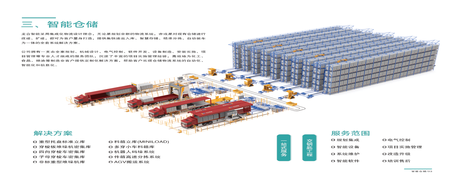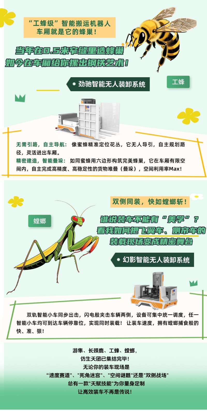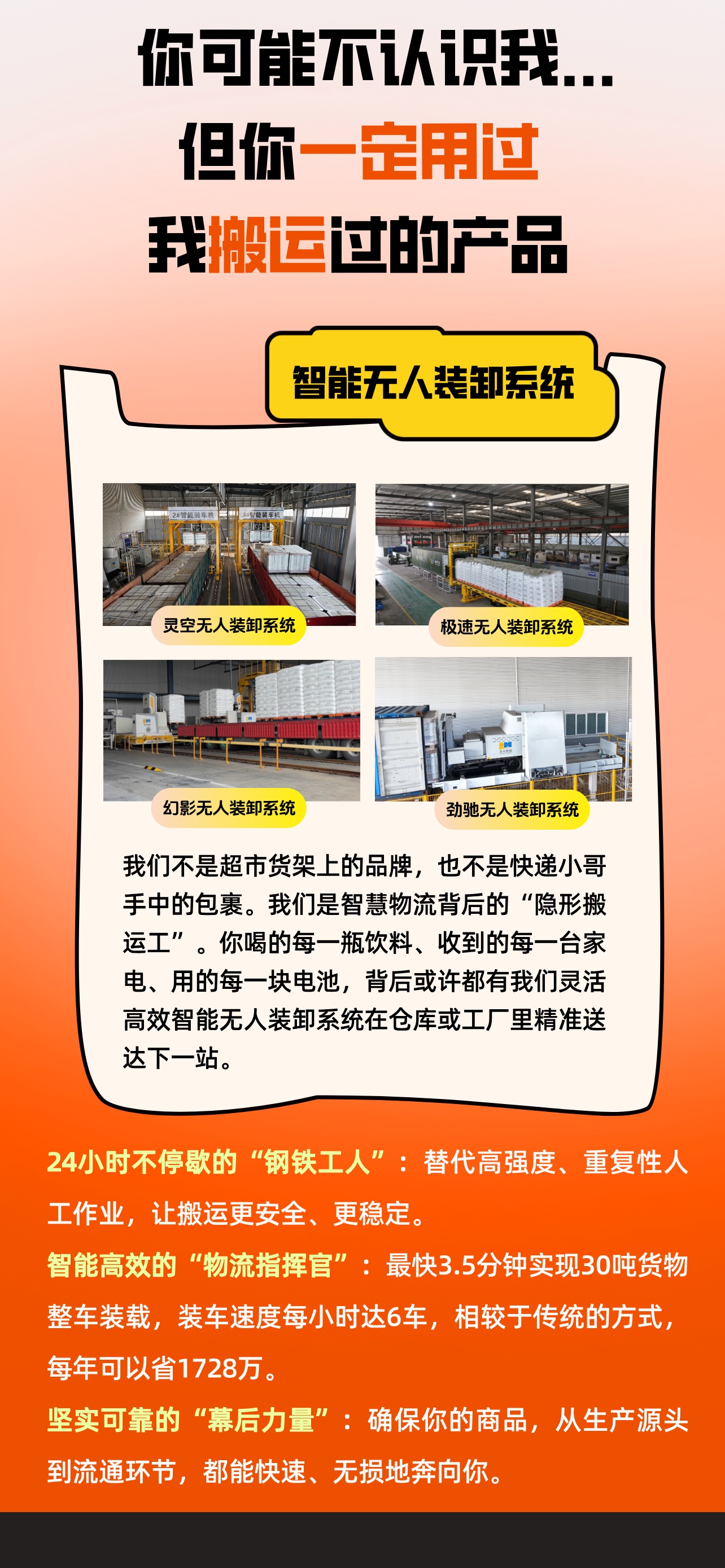 幻影/靈空/極速/勁馳四大產(chǎn)品線:全面覆蓋國(guó)內(nèi)公路運(yùn)輸所有車(chē)型,包括后裝式集裝箱車(chē)、飛翼式集裝箱車(chē)、卷簾車(chē)、邊欄板可拆放及不可拆放平板車(chē)等終端物料發(fā)貨裝車(chē),裝車(chē)過(guò)程實(shí)現(xiàn)自動(dòng)化、智能化操作,20分鐘內(nèi)完成30噸貨物裝車(chē),產(chǎn)品填補(bǔ)國(guó)內(nèi)終端物料智能無(wú)人裝車(chē)空白,可完全替代國(guó)外進(jìn)口產(chǎn)品,獲評(píng)省內(nèi)首臺(tái)(套)重大技術(shù)裝備4項(xiàng)、省級(jí)重點(diǎn)新產(chǎn)品9項(xiàng)。